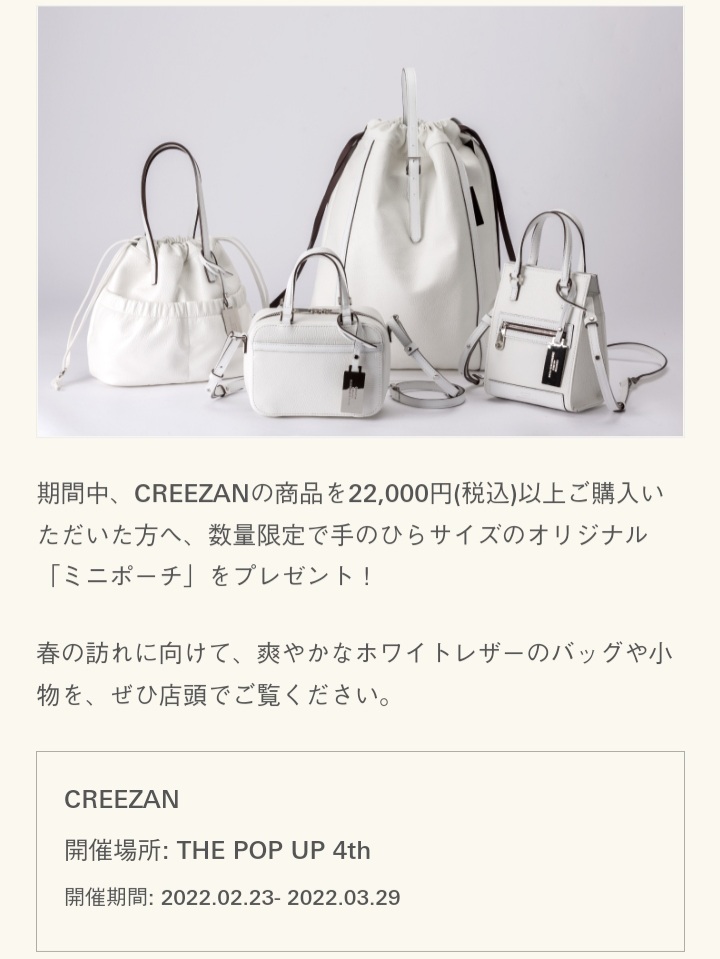 期間中、CREEZANの商品を22,000円(税込)以上ご購入いただいた方へ、数量限定で手のひらサイズのオリジナル「ミニポーチ」をプレゼント!