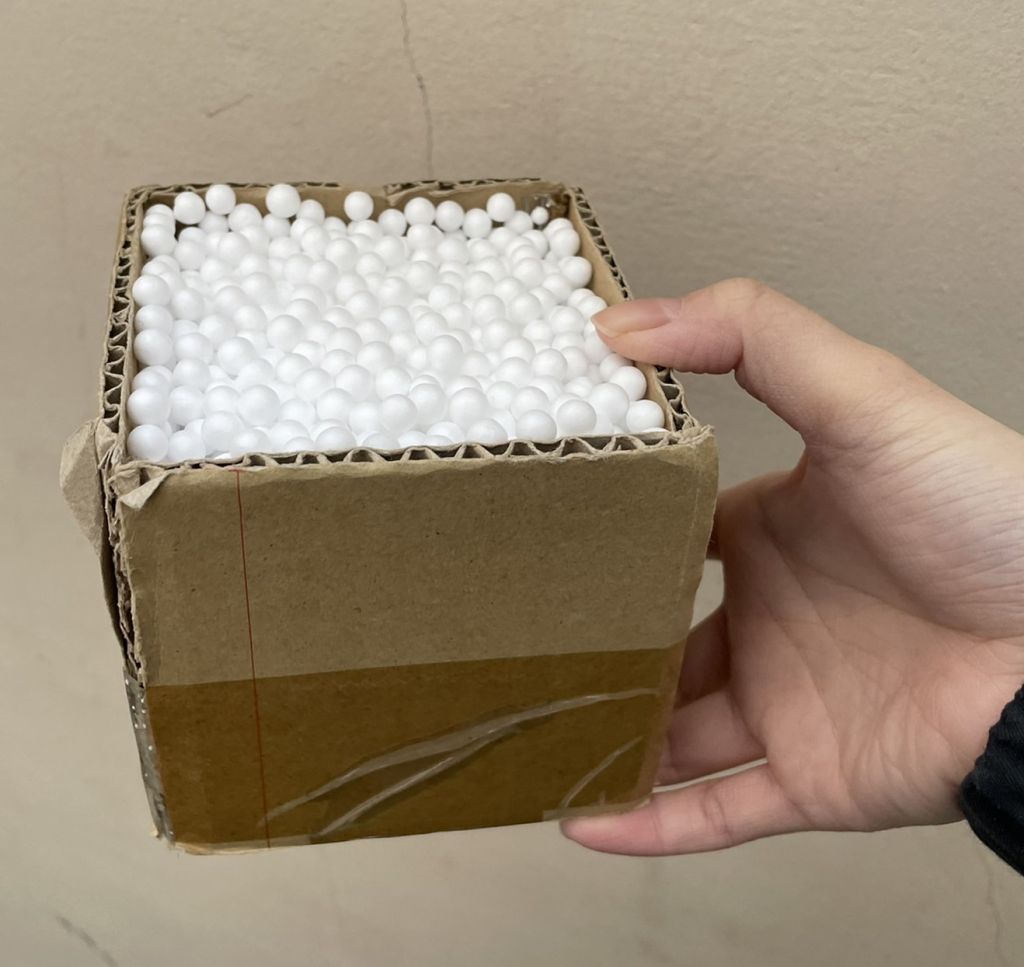 計り方は、画像の10㎝四方の容器に白い粒子をいっぱいになるまで入れます。容器がいっぱいになると1Lです。