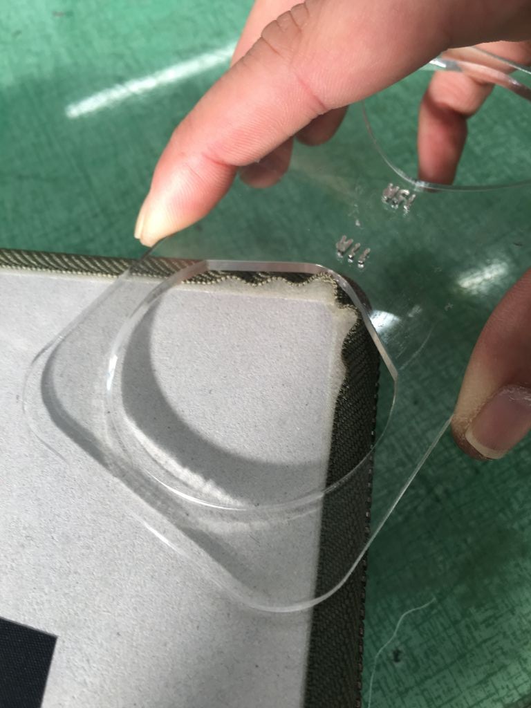 財布づくりの中で、ファスナーを型に貼る工程があります。