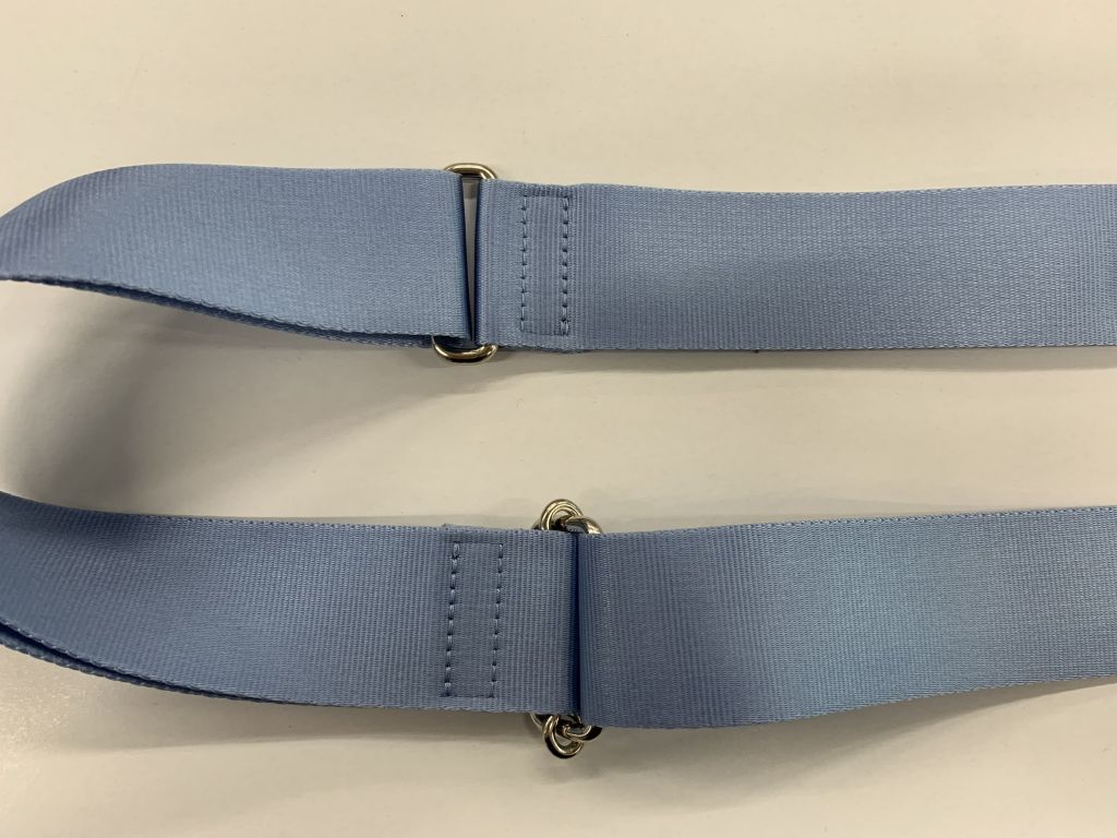 ①長いベルト、短いベルトをそれぞれ金具に通し、三つ折りにして四角ステッチを入れたものを作ります。