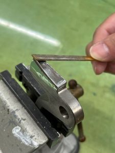 画像は、革漉きの押さえ金のメンテナンスの様子です。